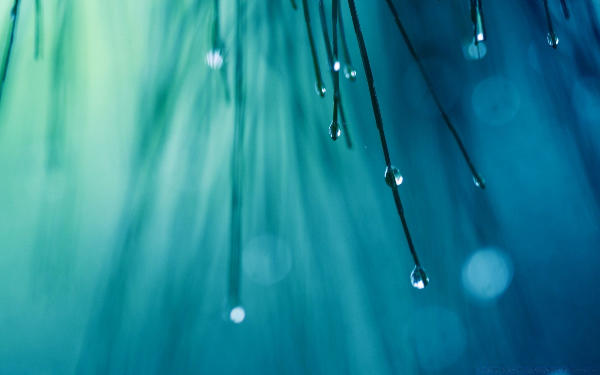 Krople deszczu spływające z rośliny na niebieskim tle z bliska