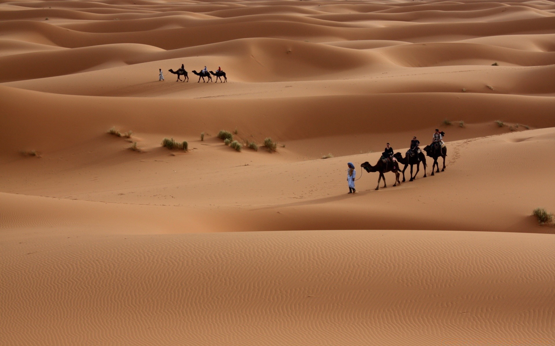 Na suchej pustyni prowadzą zmęczone wielbłądy