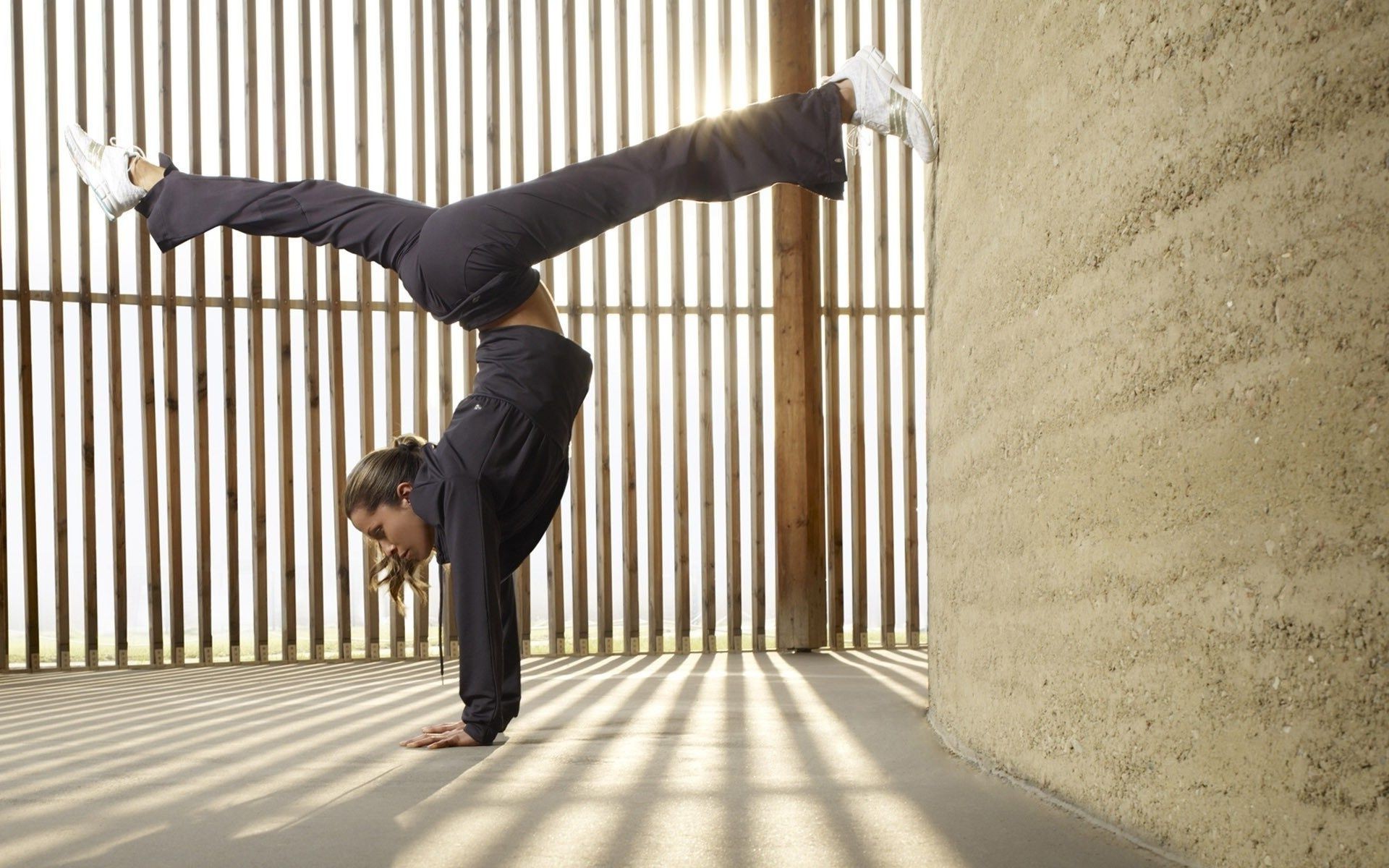 Dziewczyna robi sznurek w staniu na rękach
