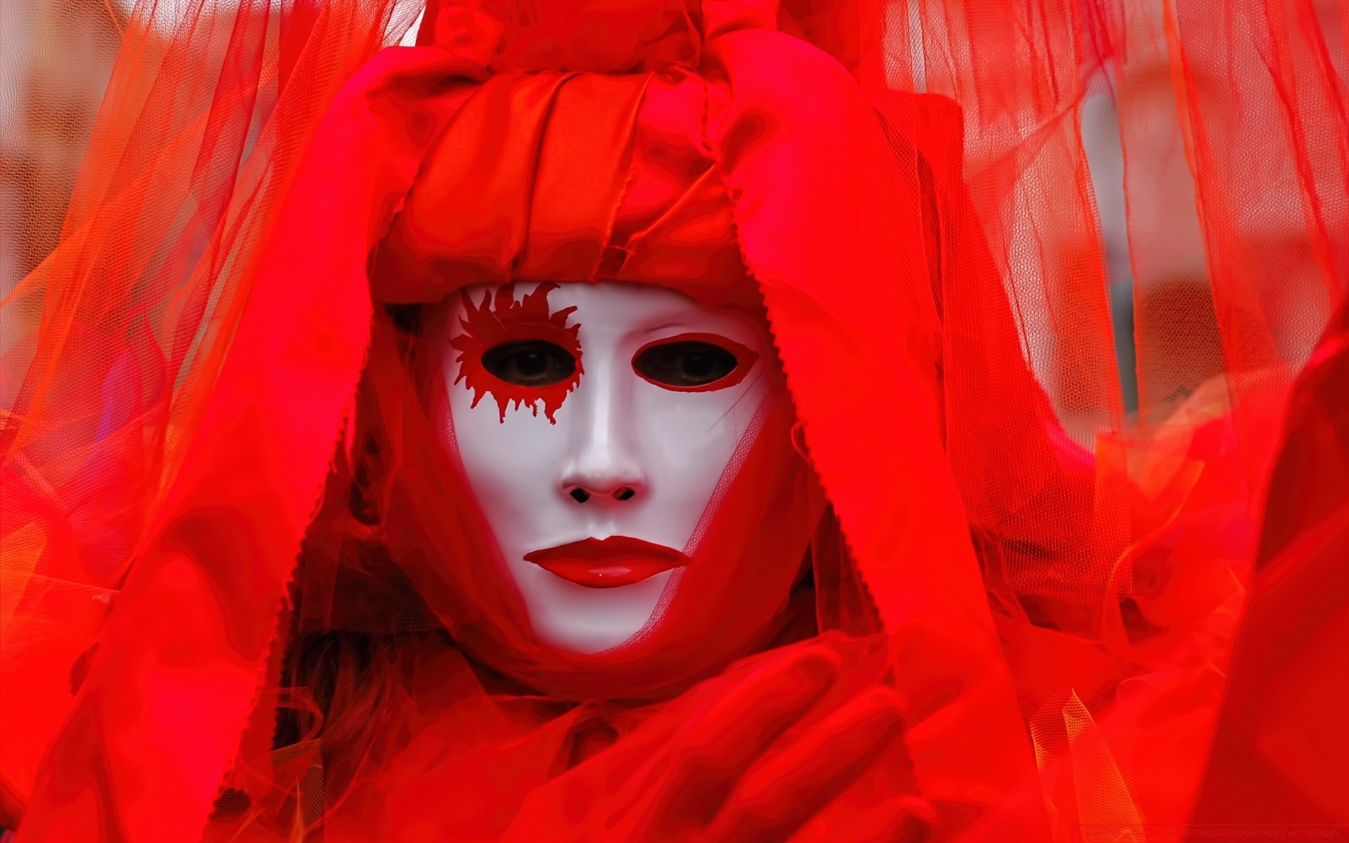 Biała maska z czerwoną szminką w czerwonym garniturze