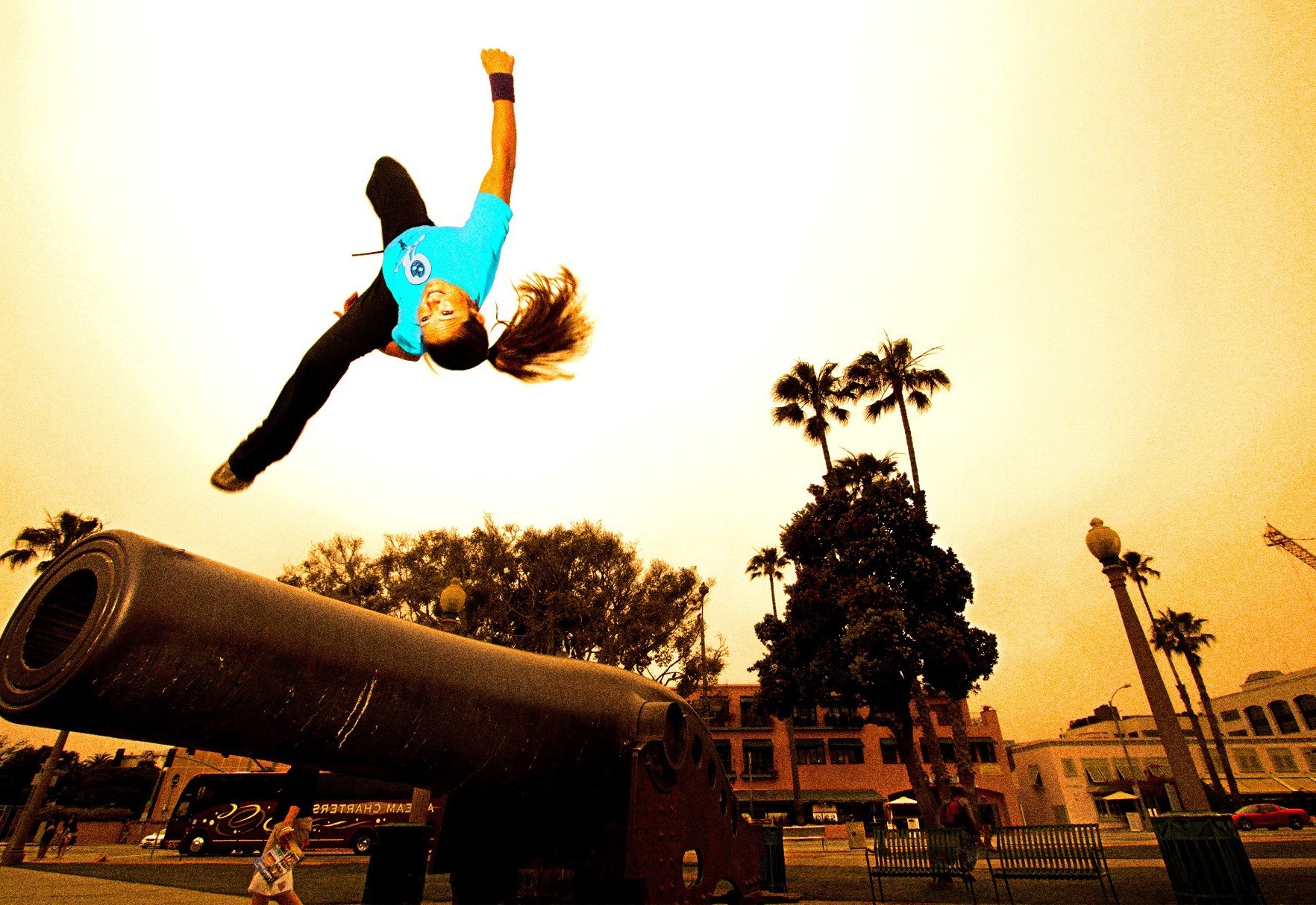 Parkour. Dziewczyna wykonuje boczny salto z przeszkody