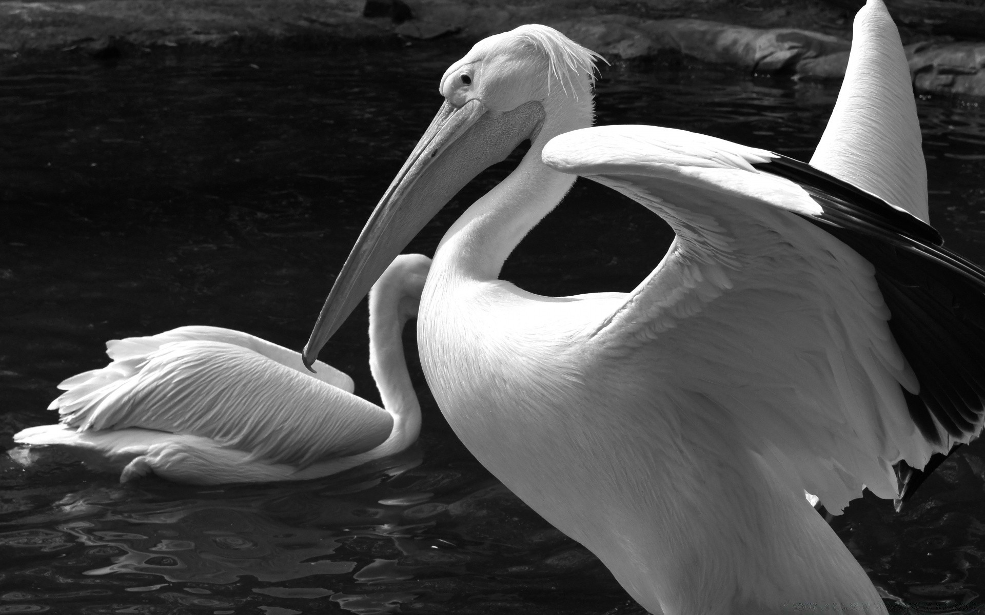 Pelikany w wodzie w odcieniach czerni i bieli