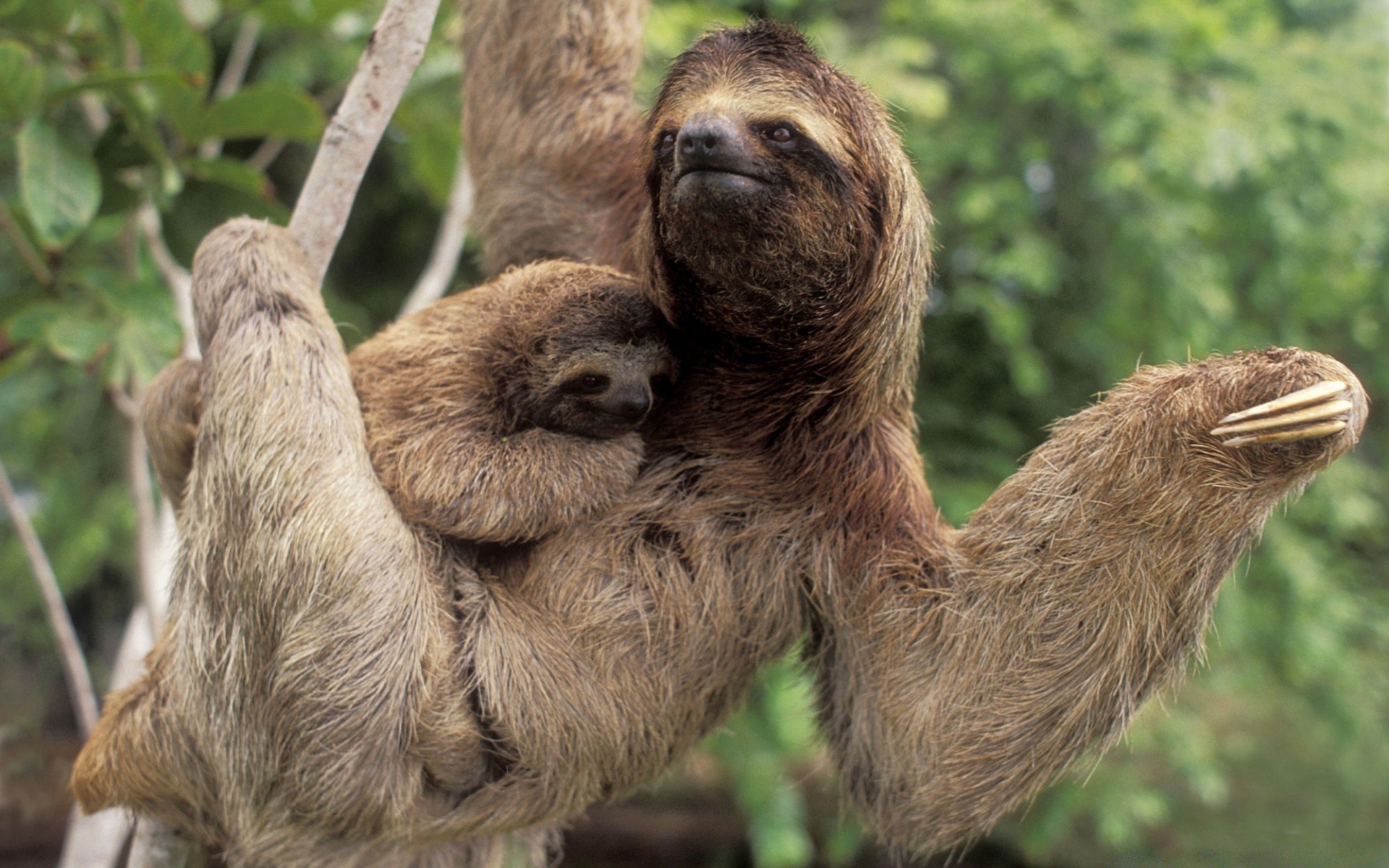 Leniwiec na gałęzi z młodym