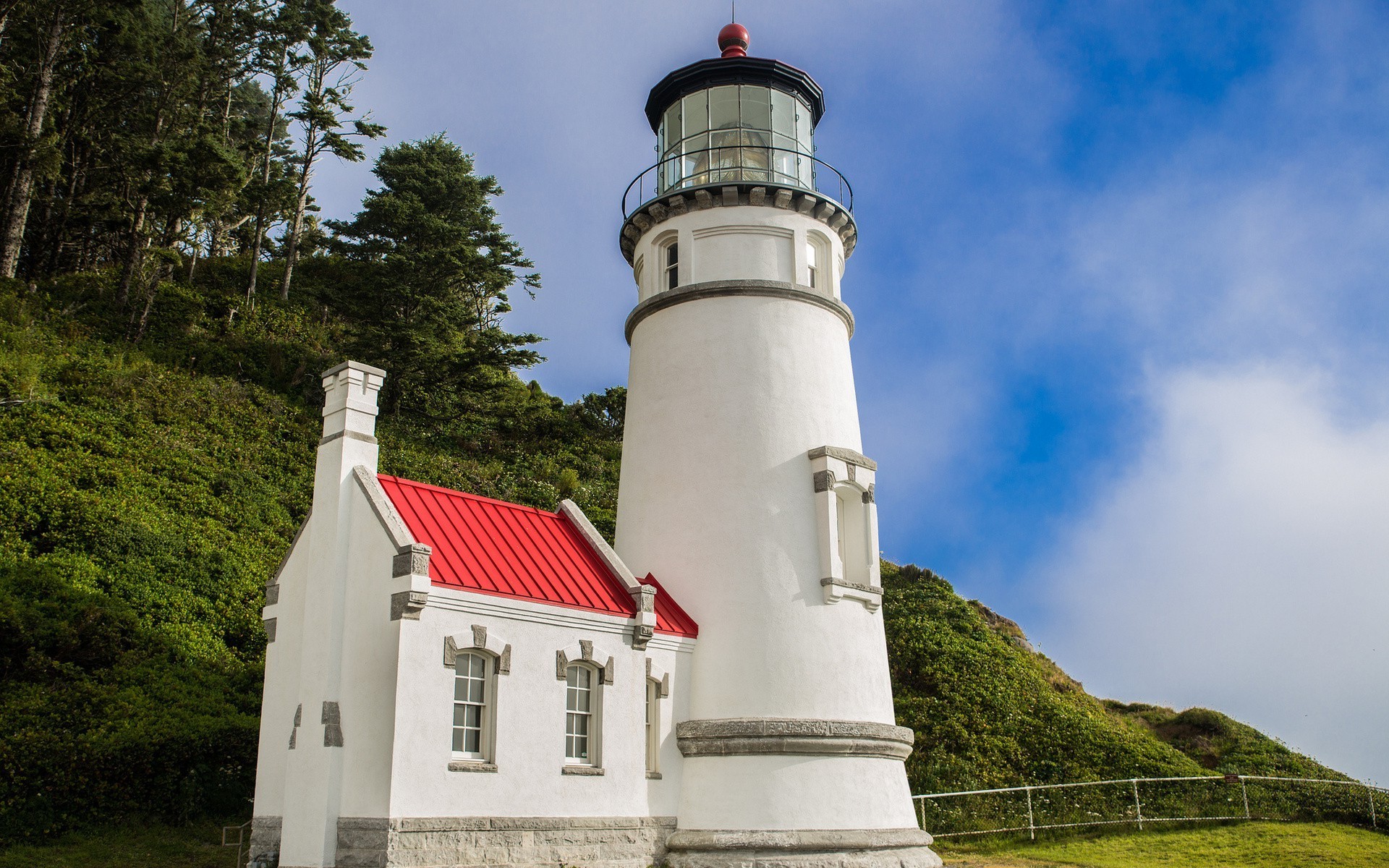 Biała Latarnia morska u podnóża góry