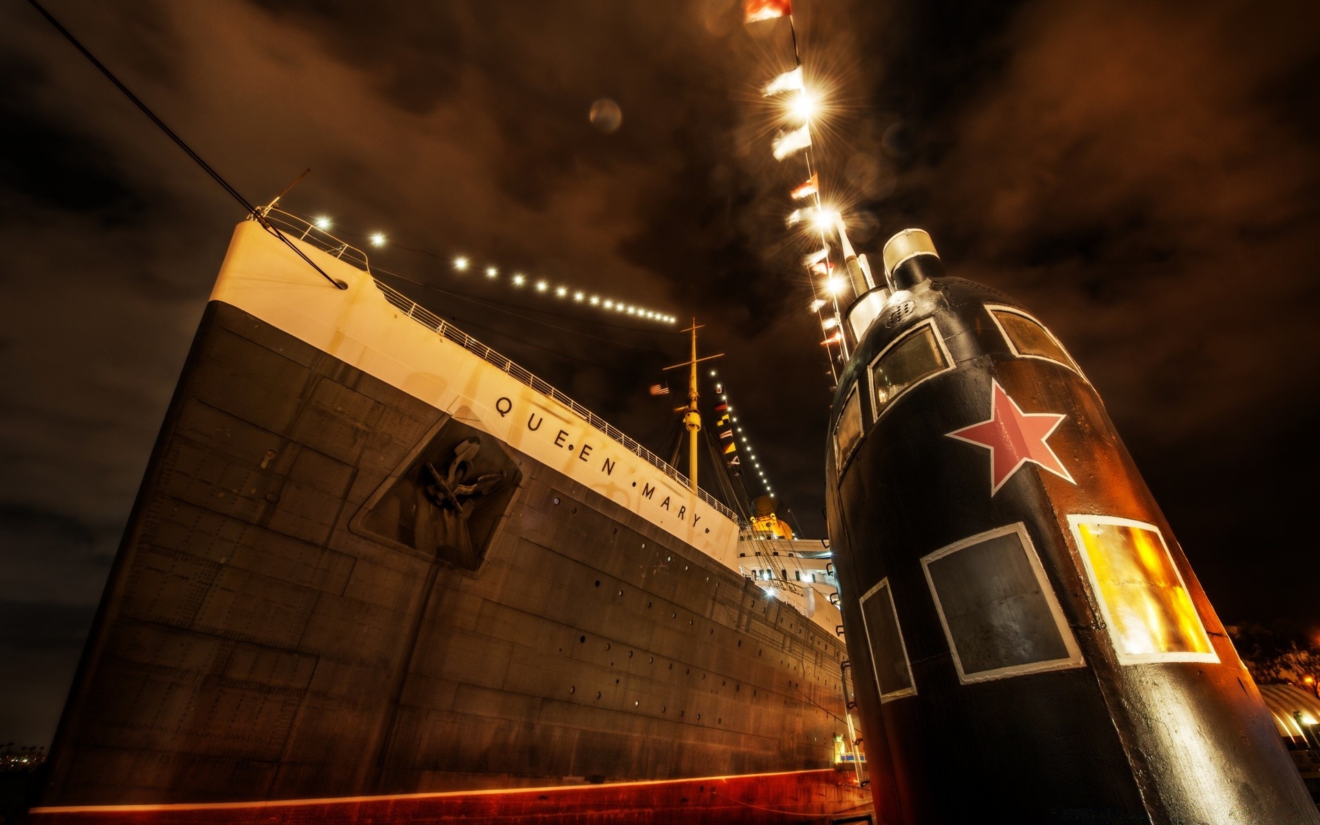 Statek motorowy w nocnej rzece na tle ciemnych górStatek motorowy w nocnej rzece na tle ciemnych gór