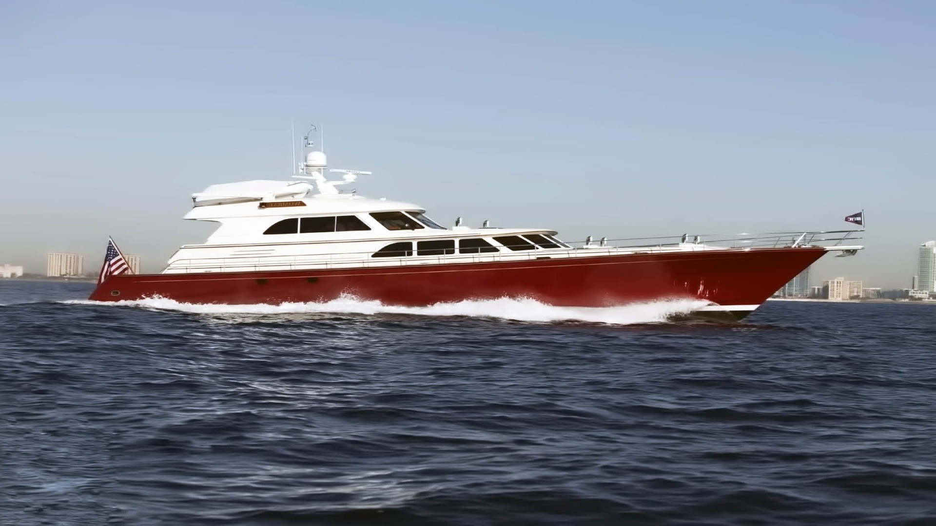 Biało-czerwony jacht z flagą ameryki
