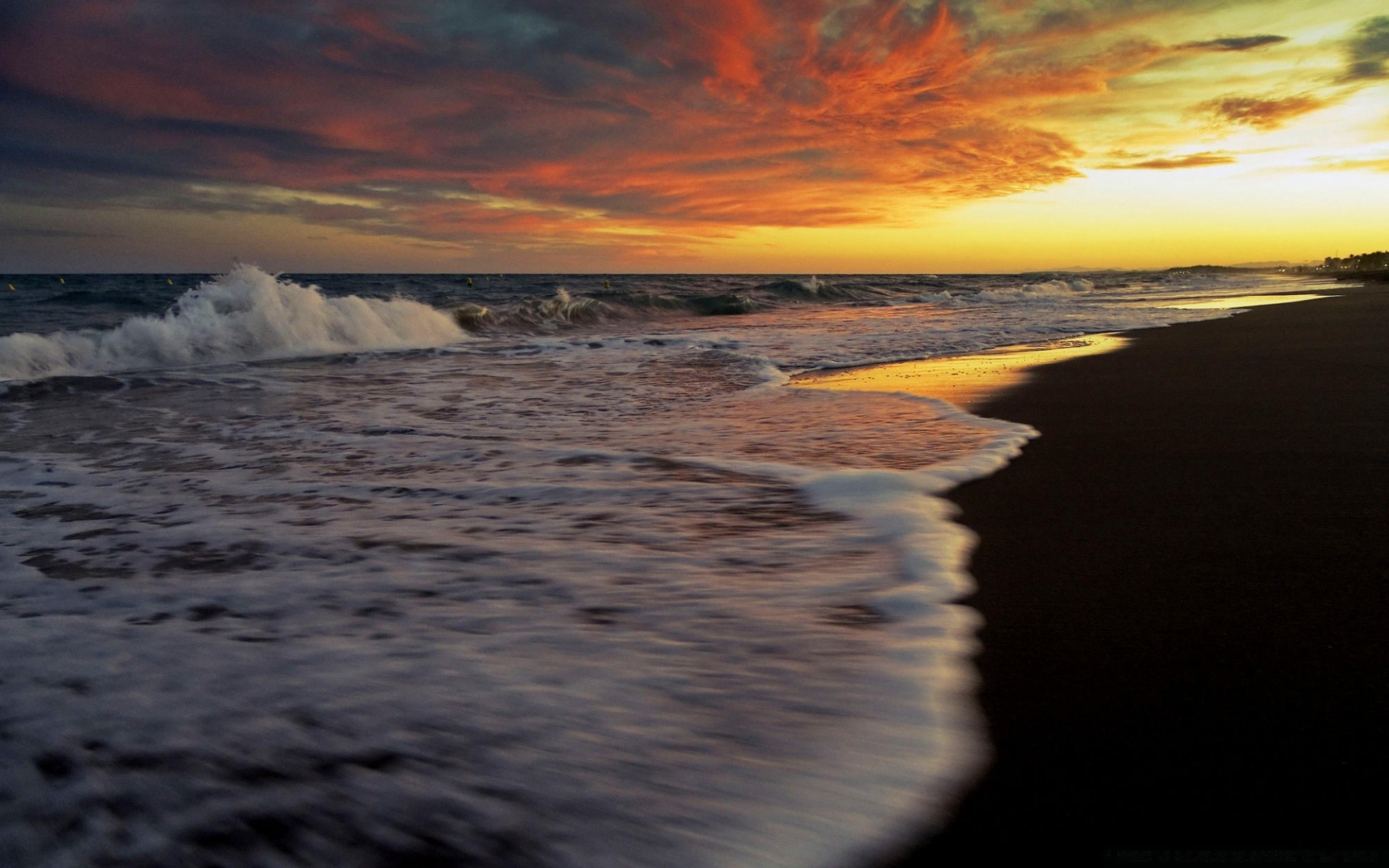 Piaszczysta plaża ze skałami o zachodzie słońca