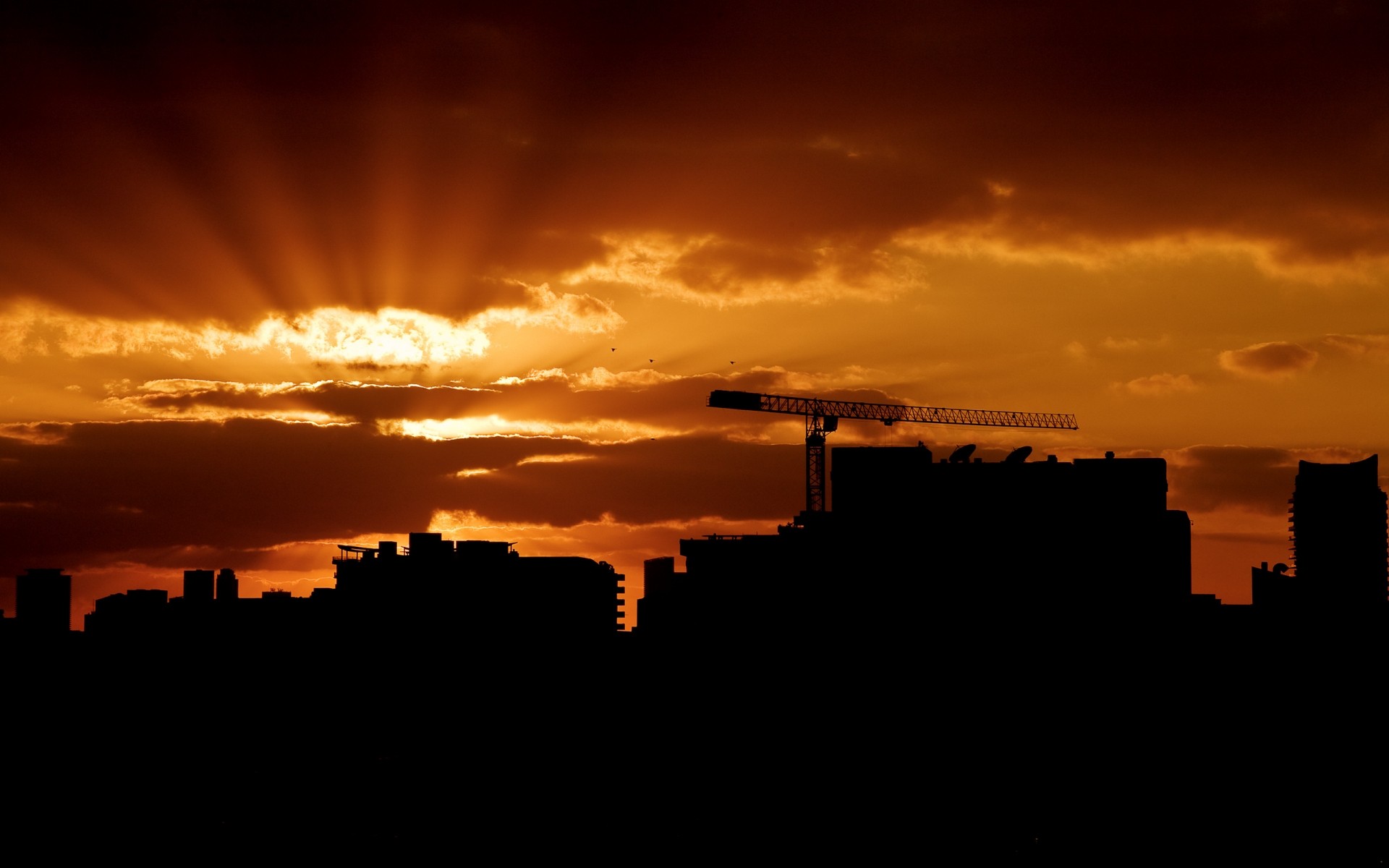 Zachód słońca nad miastem oświetlony słońcem