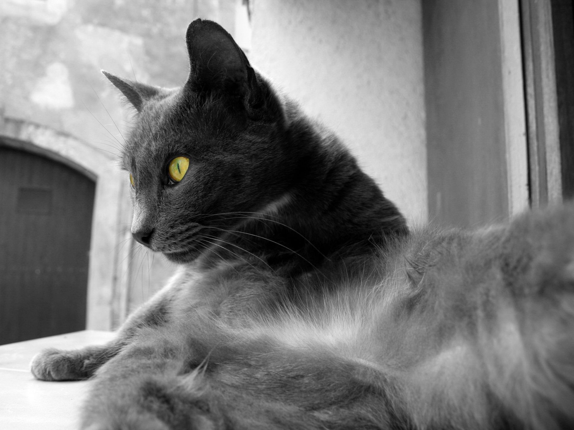 Niebieski kot z mądrym spojrzeniem żółtych oczu