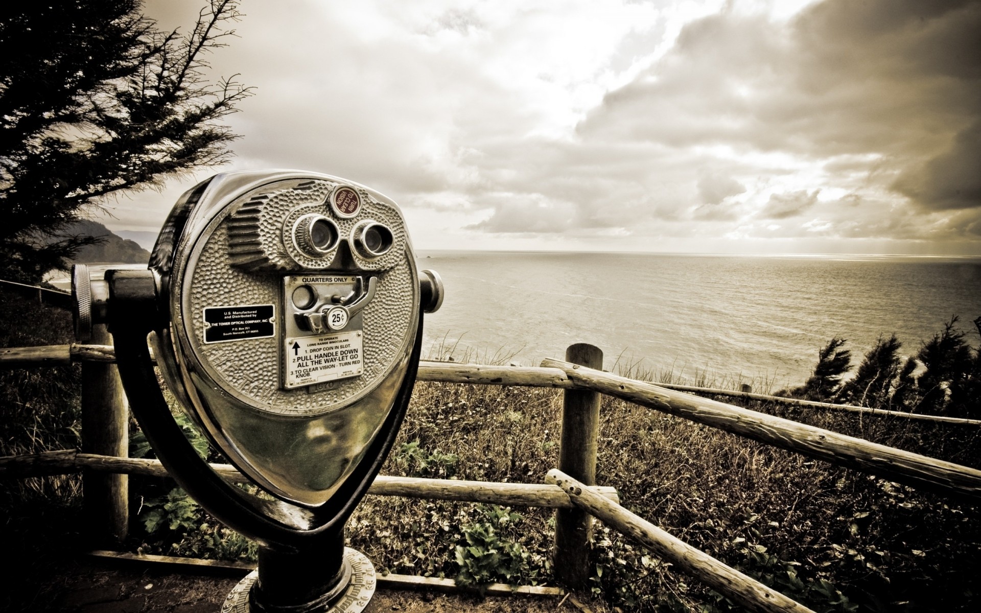 Monochromatyczne zdjęcie morza z lornetką przy ogrodzeniu