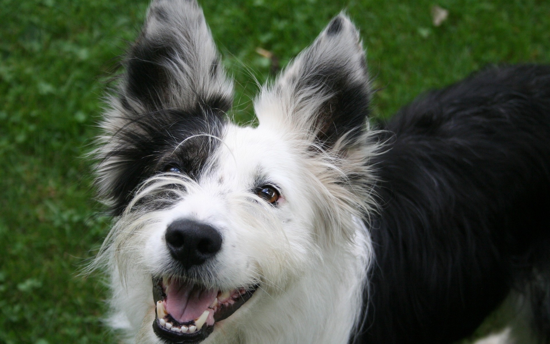 Czarno-biały pies ze stojącymi uszami uśmiecha się i pokazuje zęby