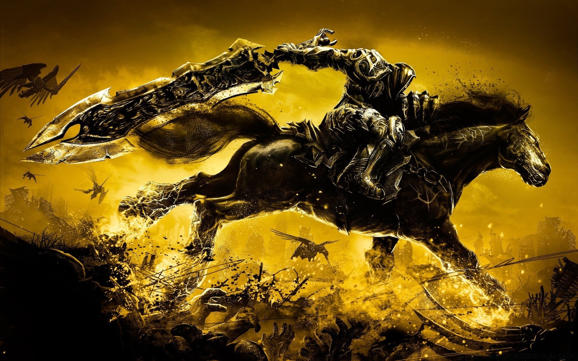 Rycerz na koniu w stylu fantasy w złotej gamie