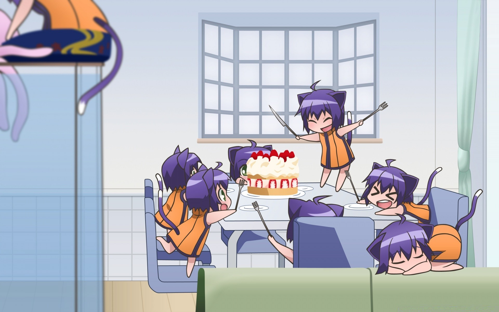 Anime Little Neko-Chan świętuje urodziny. Świąteczny stół z ciastem