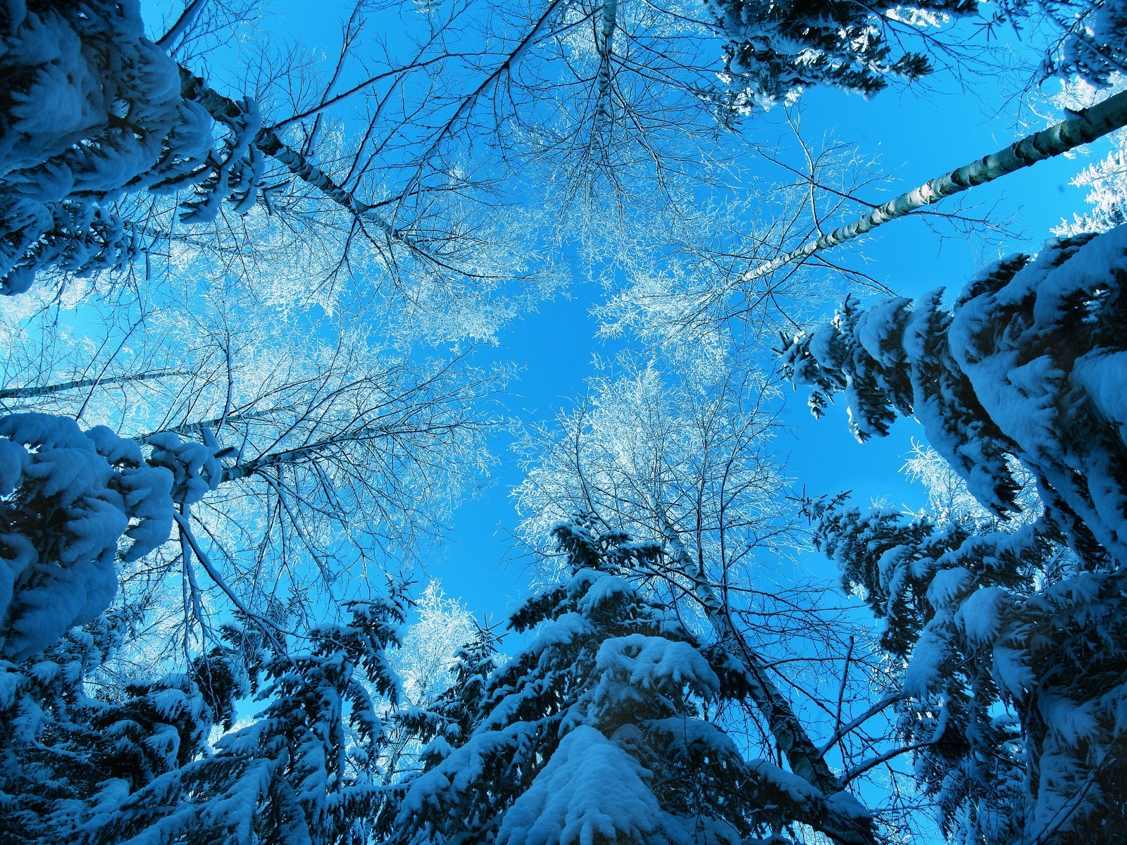Zimowe zasypane śniegiem zamykające się ku górze drzewa