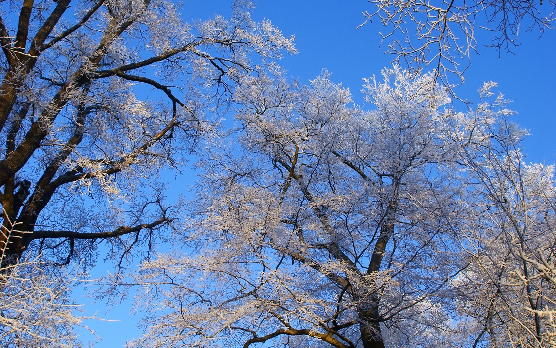Zimowe drzewa w szronie na tle nieba