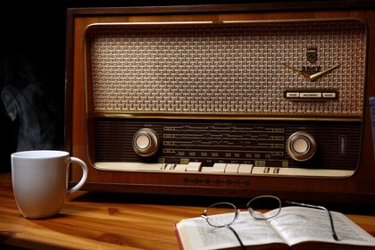 Drewniane Radio Retro obok kubka