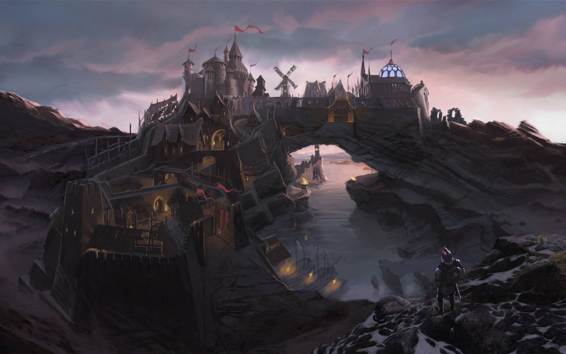 Rycerz w zbroi na tle mglistej przyrody w górach