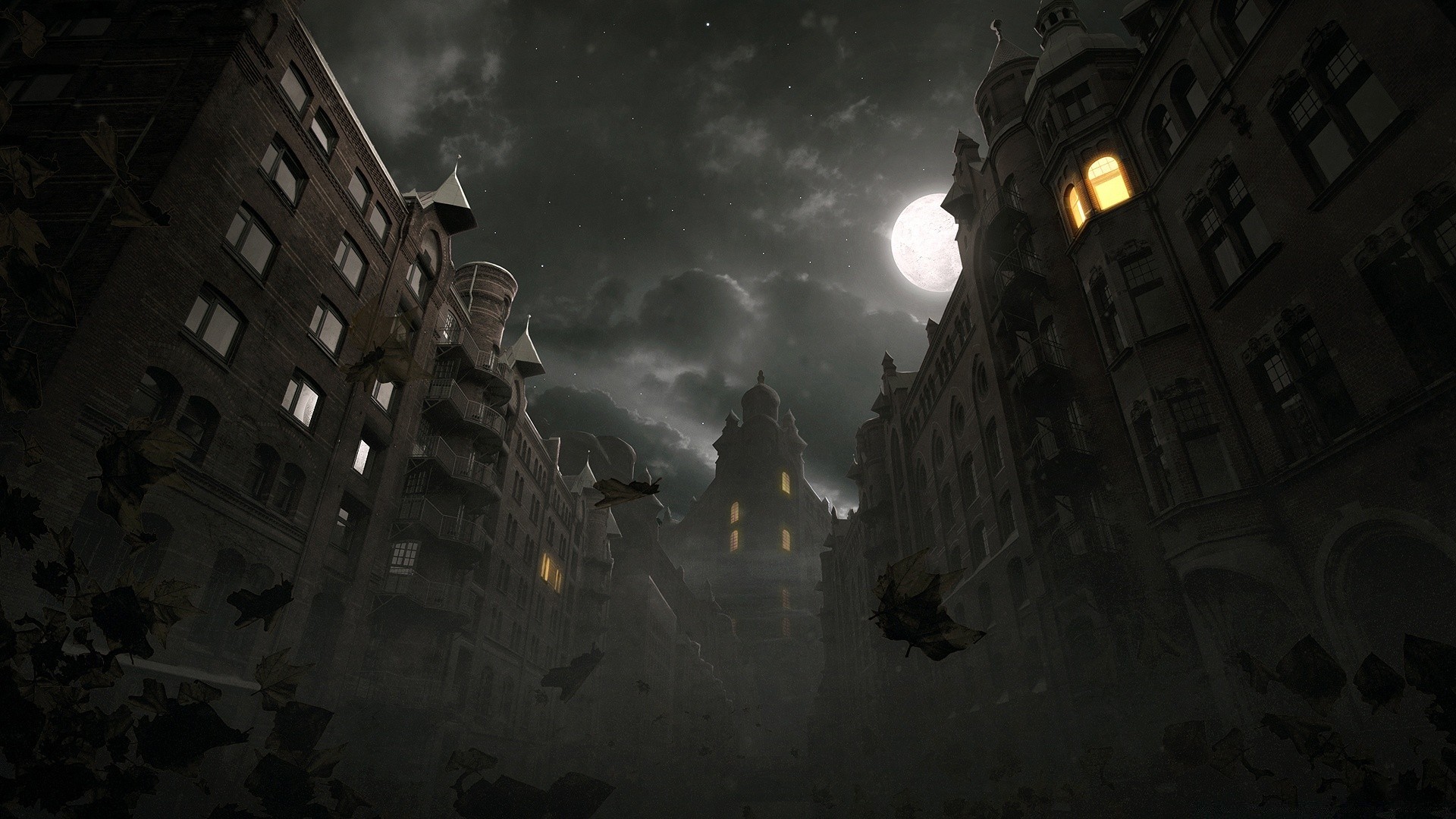 Batman na swoim czarnym motocyklu na tle nocnego miastaBatman na swoim czarnym motocyklu na tle nocnego miasta