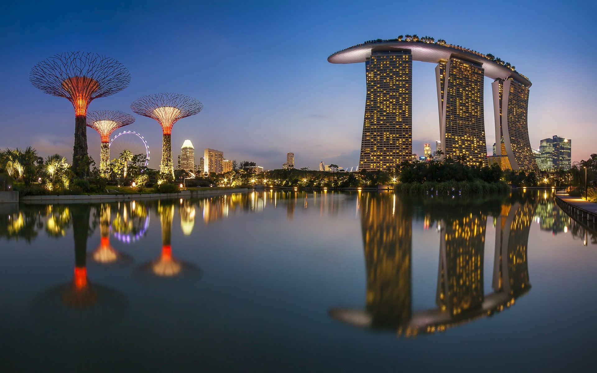 Odbicie drapaczy chmur w stawie miejskim. Miasto Singapur