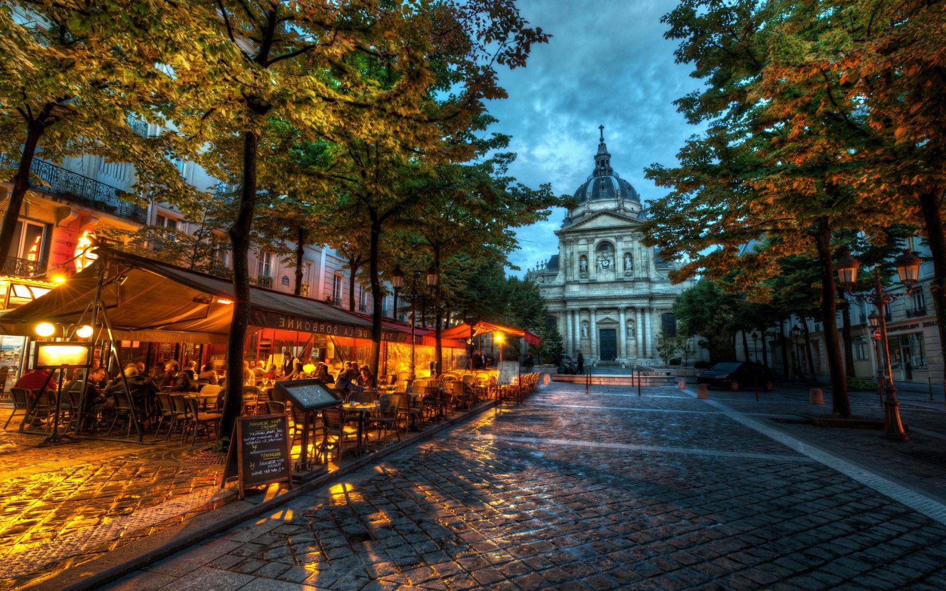 Restauracja w świetle latarni pod zmierzchowym niebem