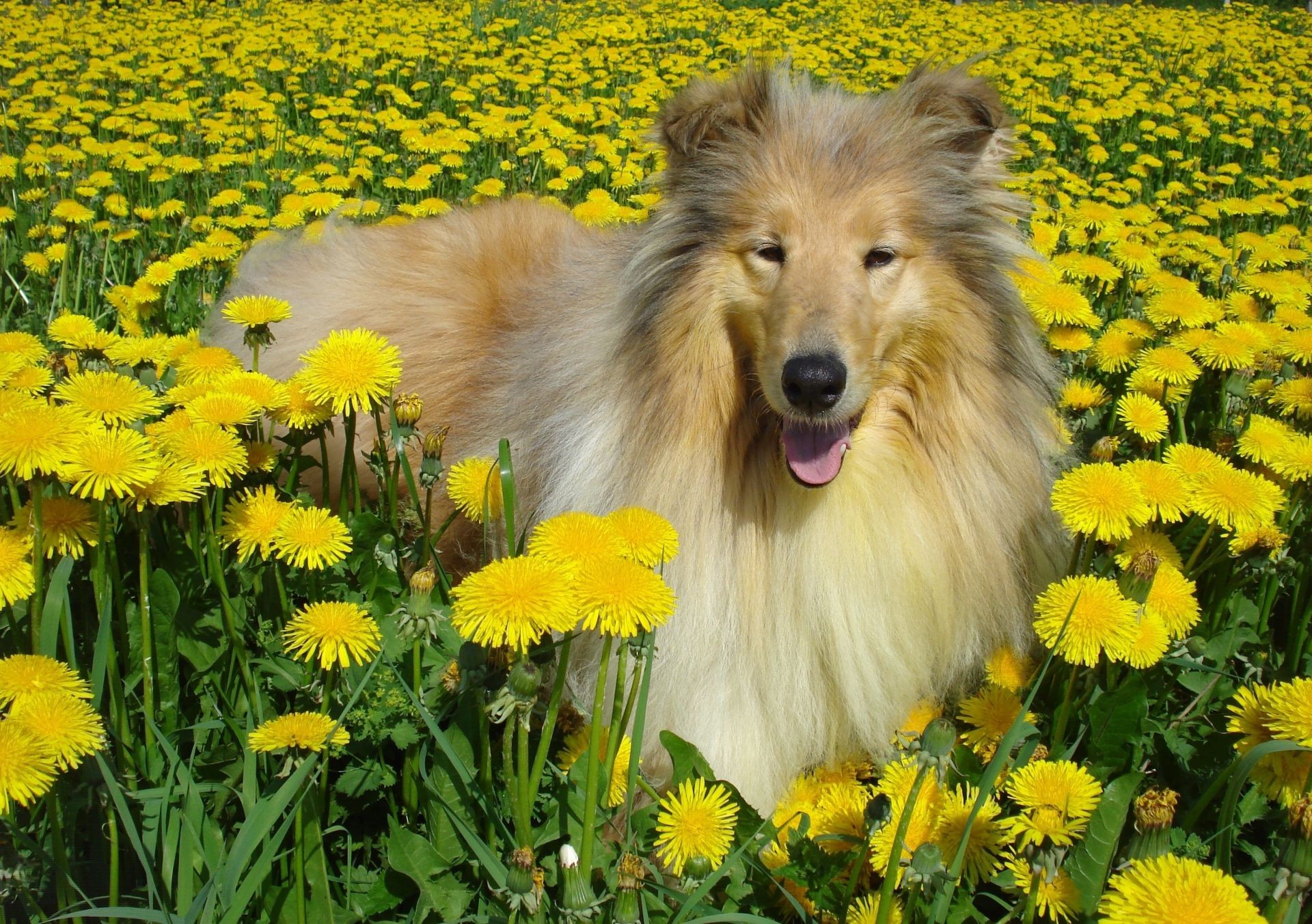 Uroczy uśmiech psa w kwiatach mniszka lekarskiego