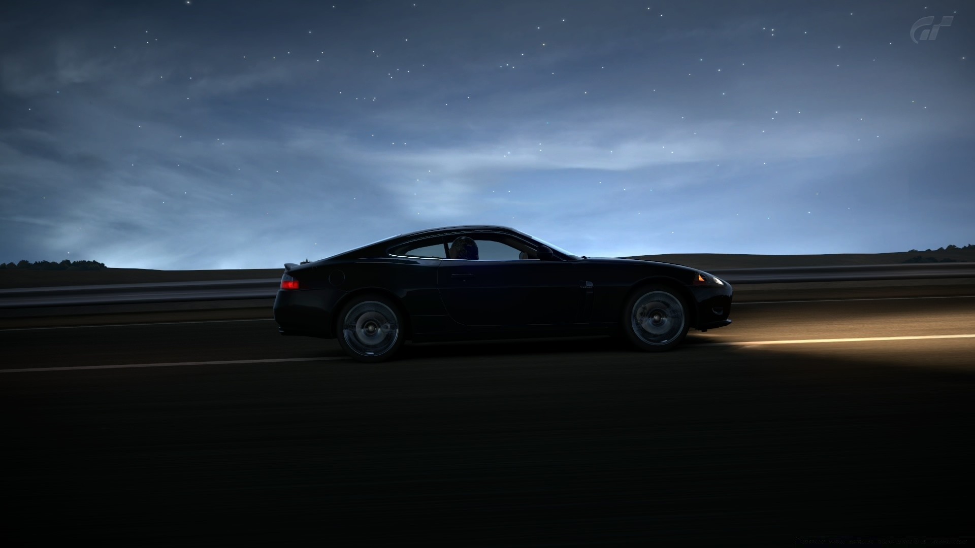 Samochód jedzie z włączonymi światłami po nocnej drodze