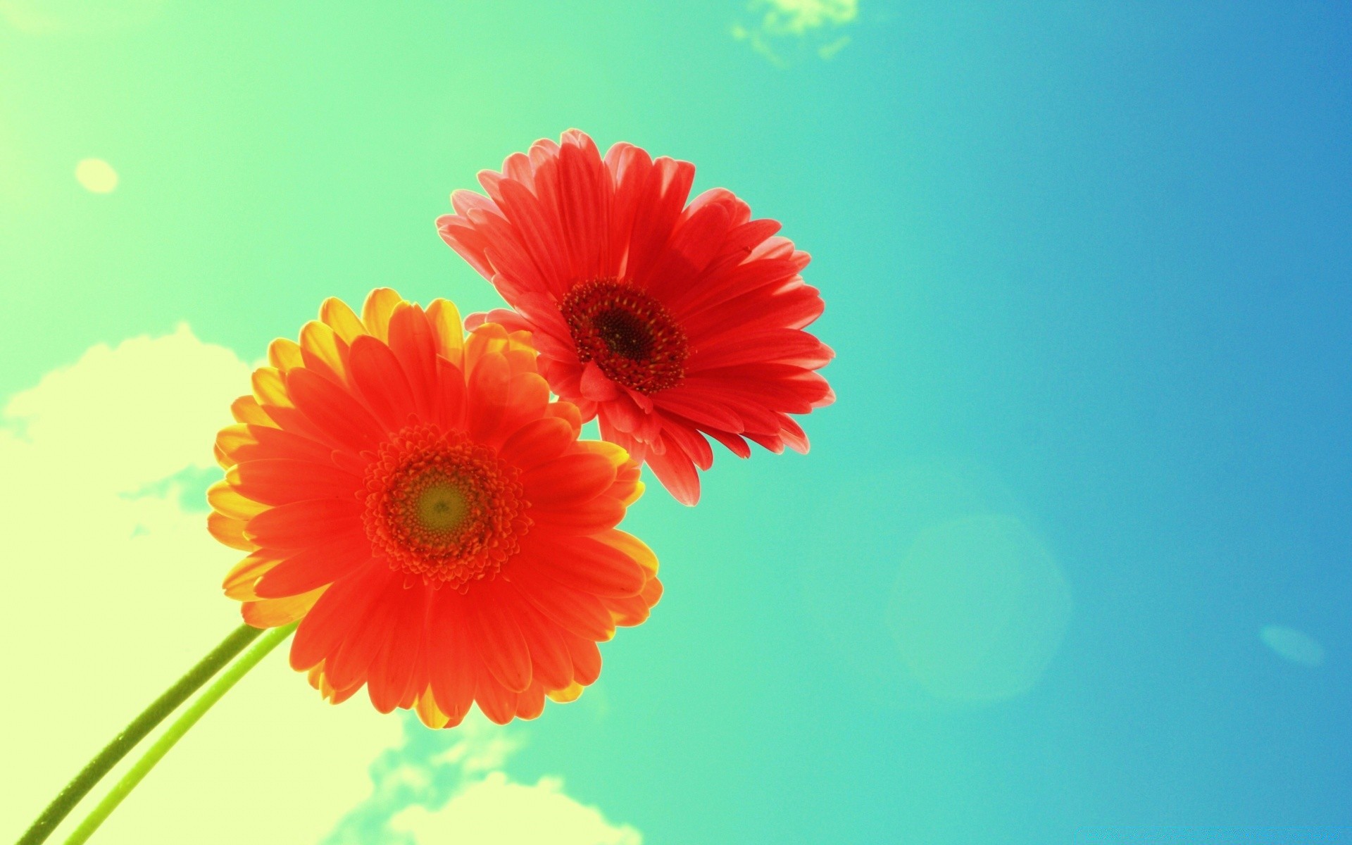 Dwa kwiaty szkarłatnych Gerber na niebieskim tle