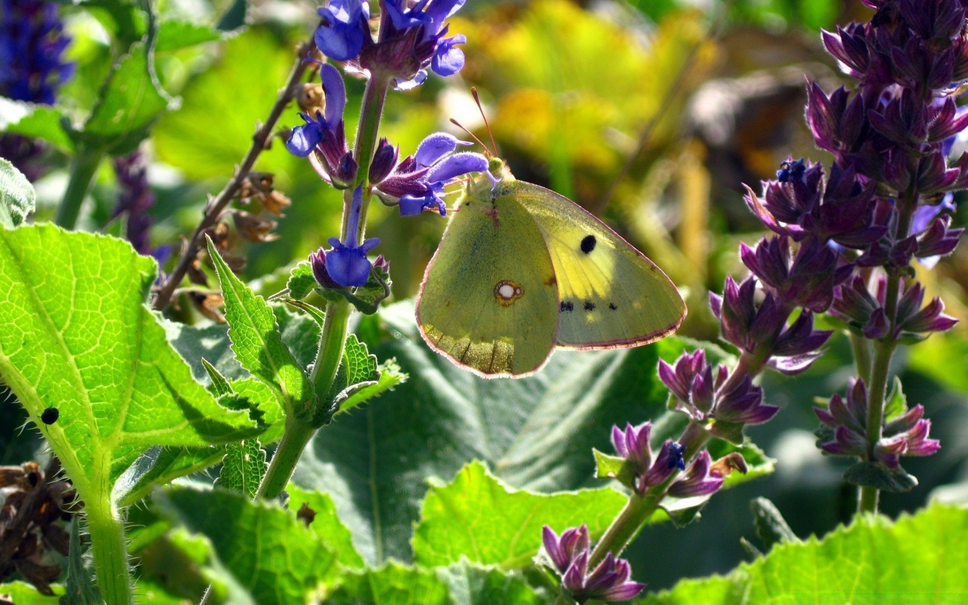 Zielony motyl na łodydze z fioletowymi kwiatami