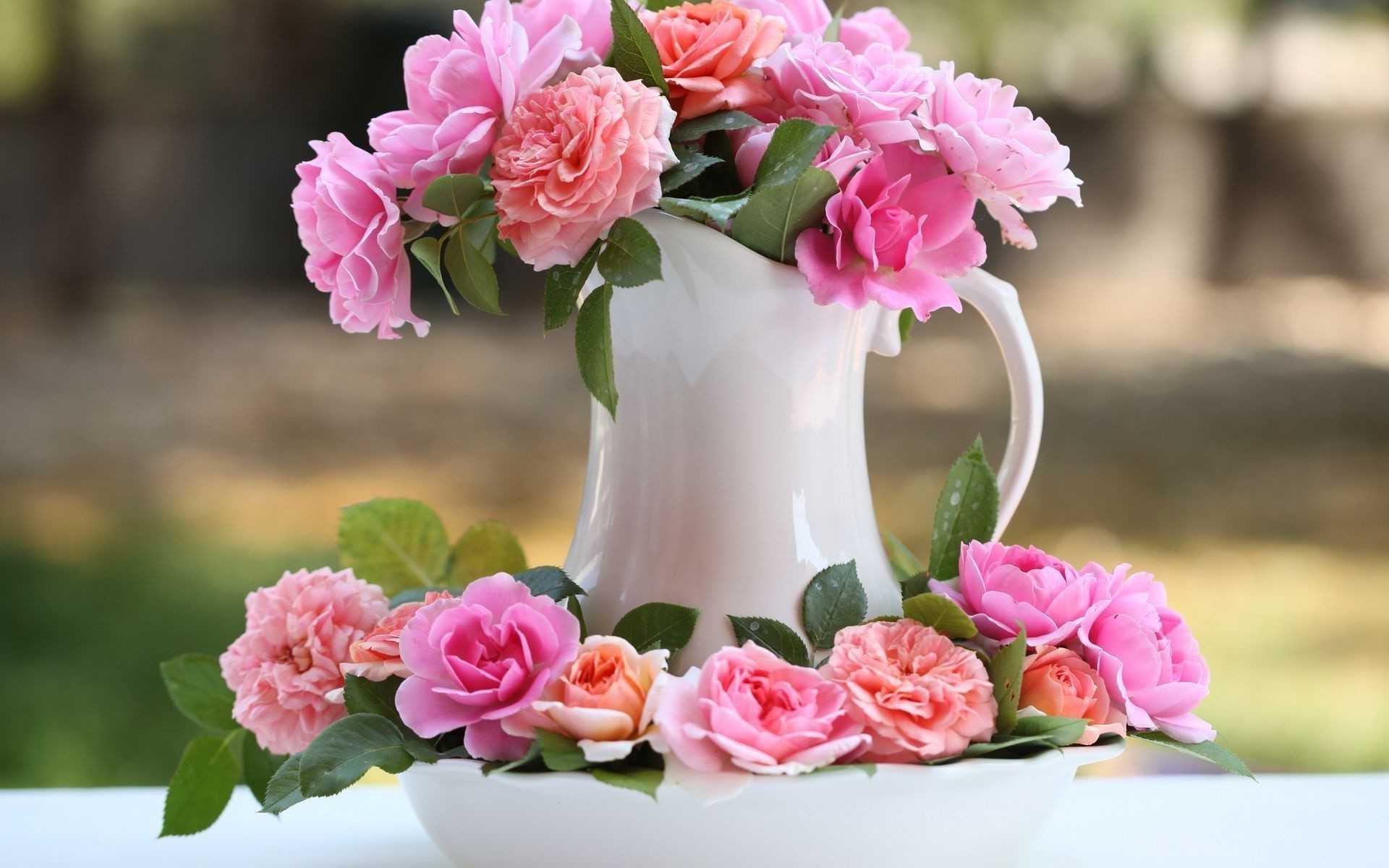 Bukiet róż w doniczce w pobliżu ceglanej ściany
