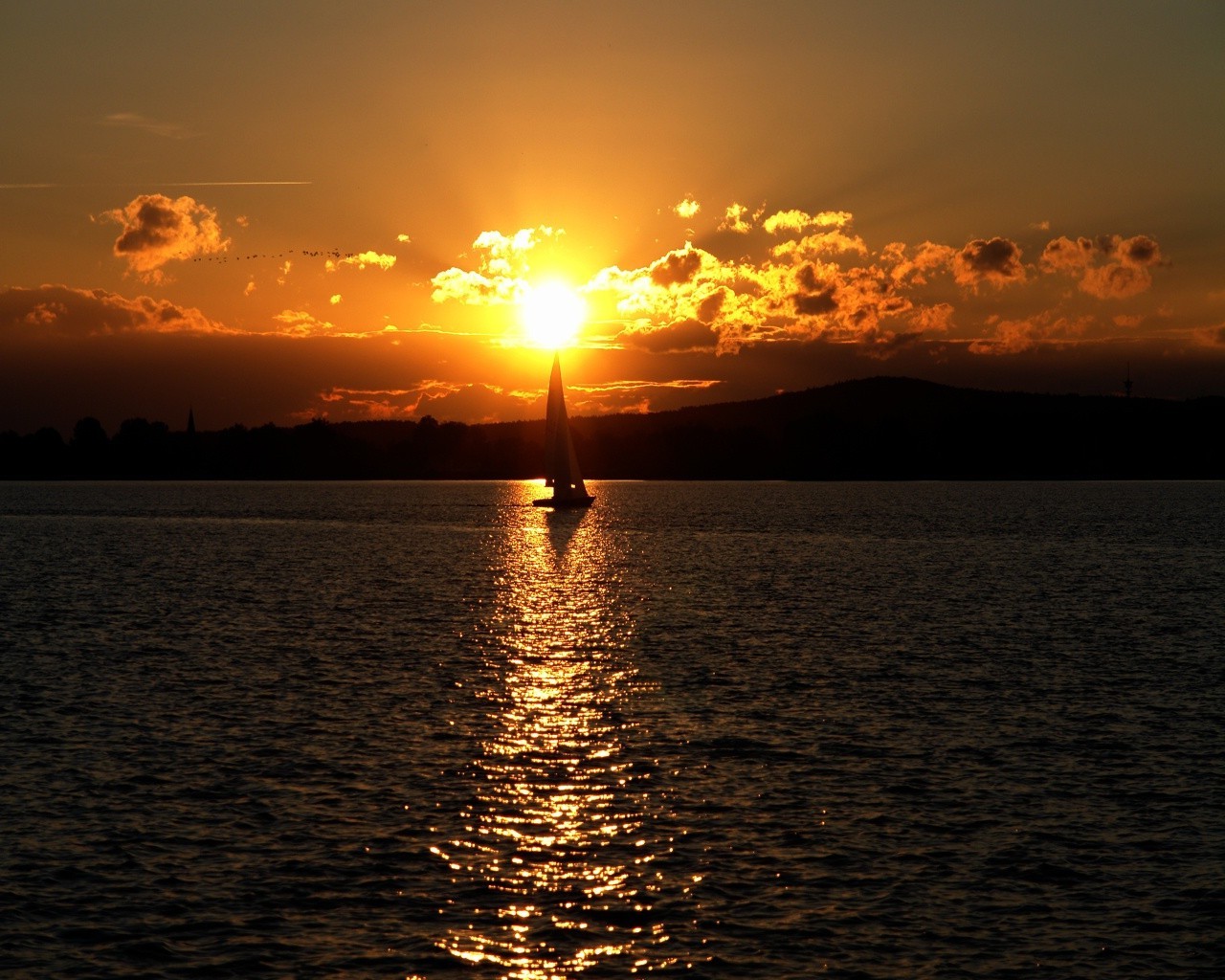 Jezioro piękny zachód słońca niebo człowiek idzie po wodzieJezioro piękny zachód słońca niebo człowiek idzie po wodzie