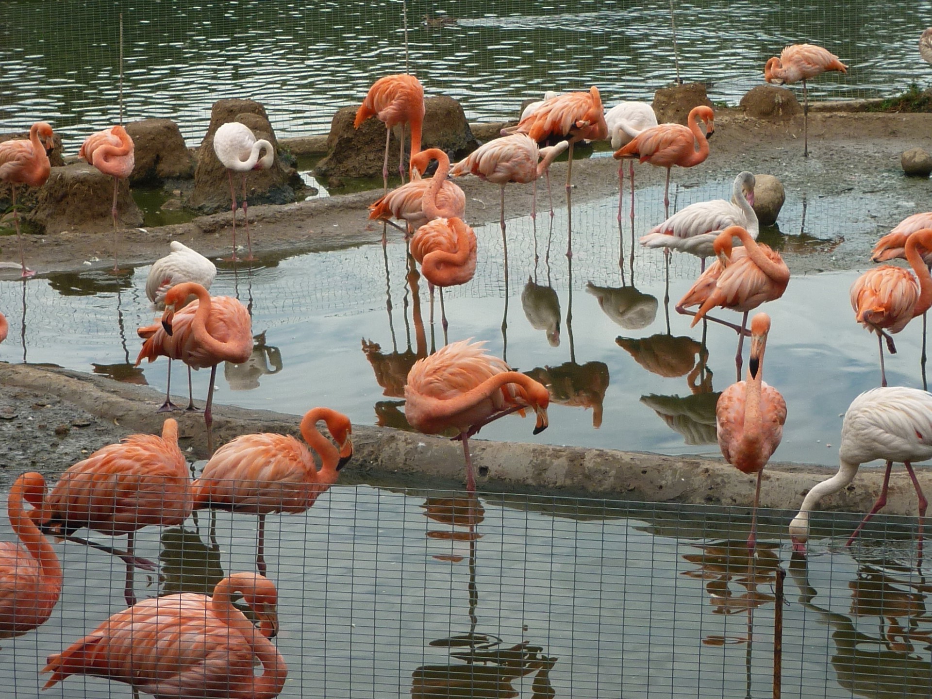 Wiele różowych flamingów stoi w wodzie