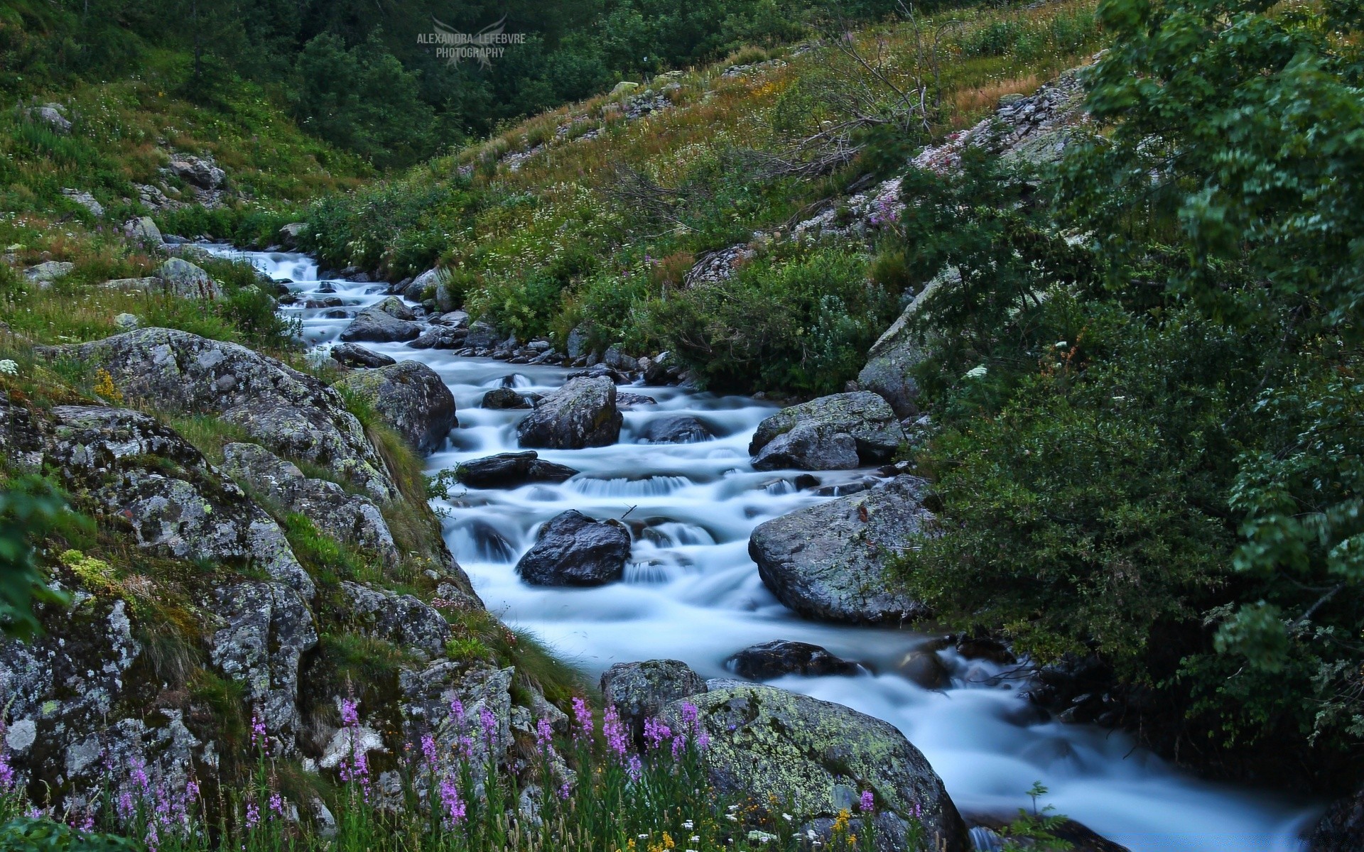 Górski potok w pagórkowatym terenie