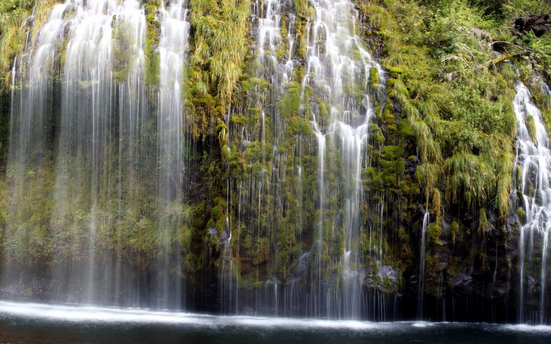 Cienkie strumienie wodospadu obmywają drzewa na zboczu góry