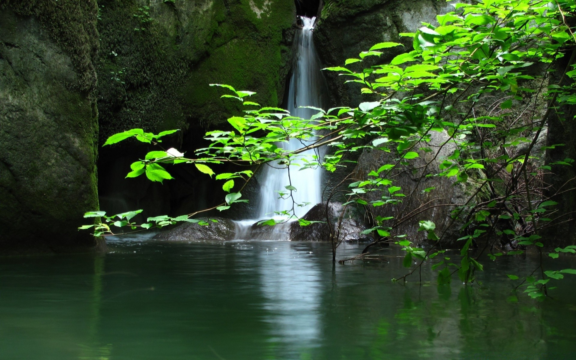 Letni krajobraz wodospadu wśród drzew na zboczu góry
