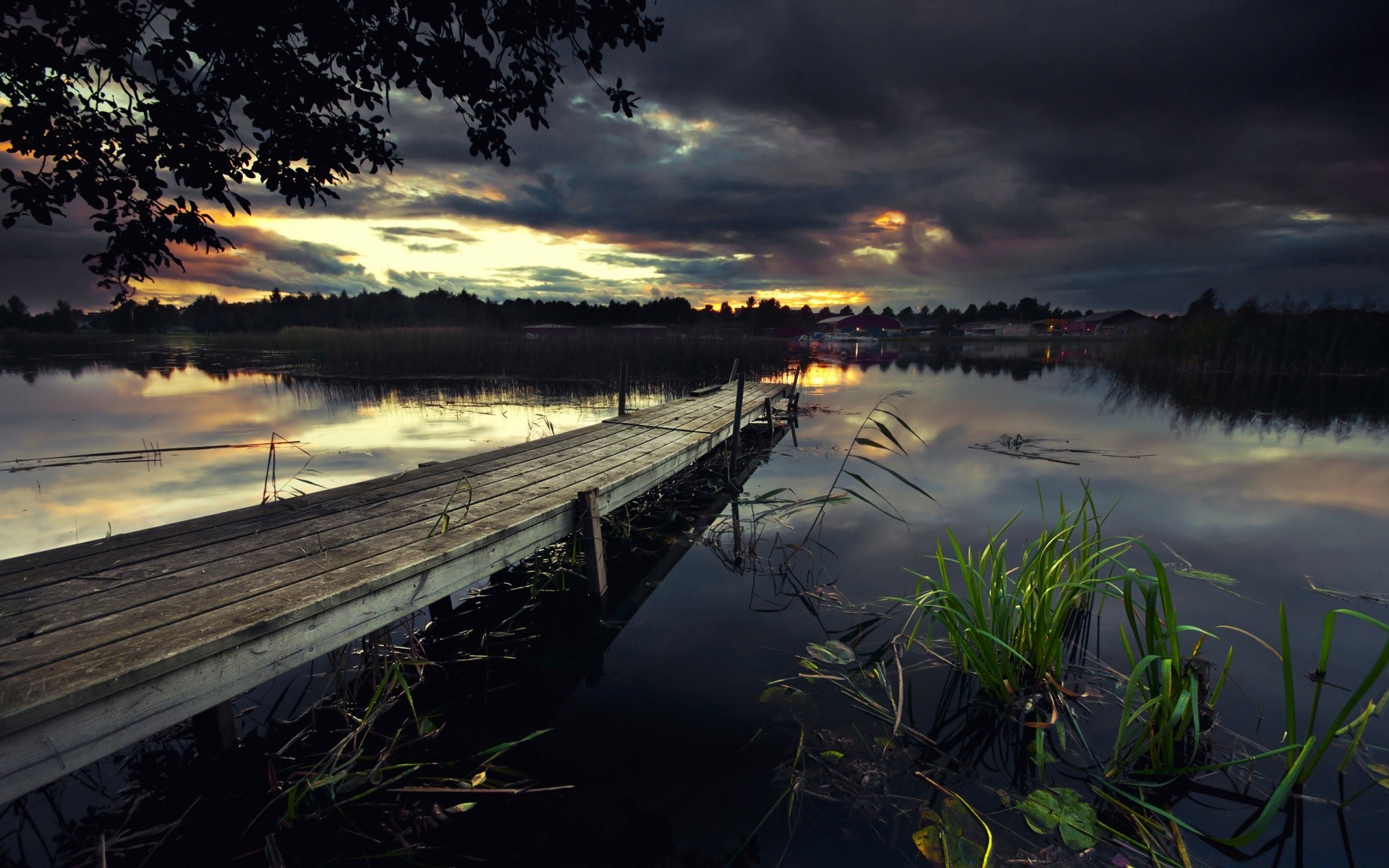 Jasne odbicie zachodu Słońca i lasu na wodzie