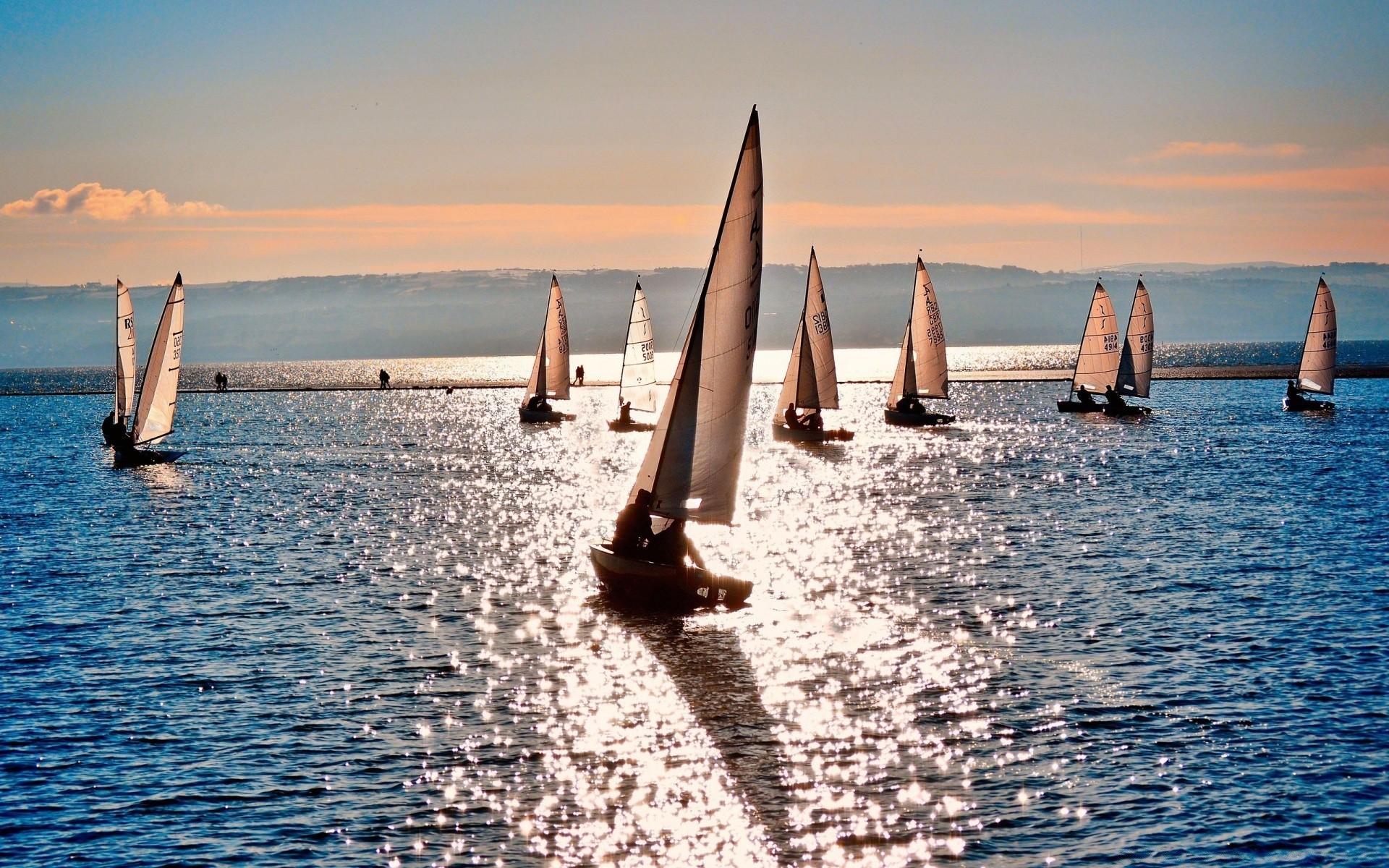 Wiele żaglówek w wodzie odbijającej Zachód słońca