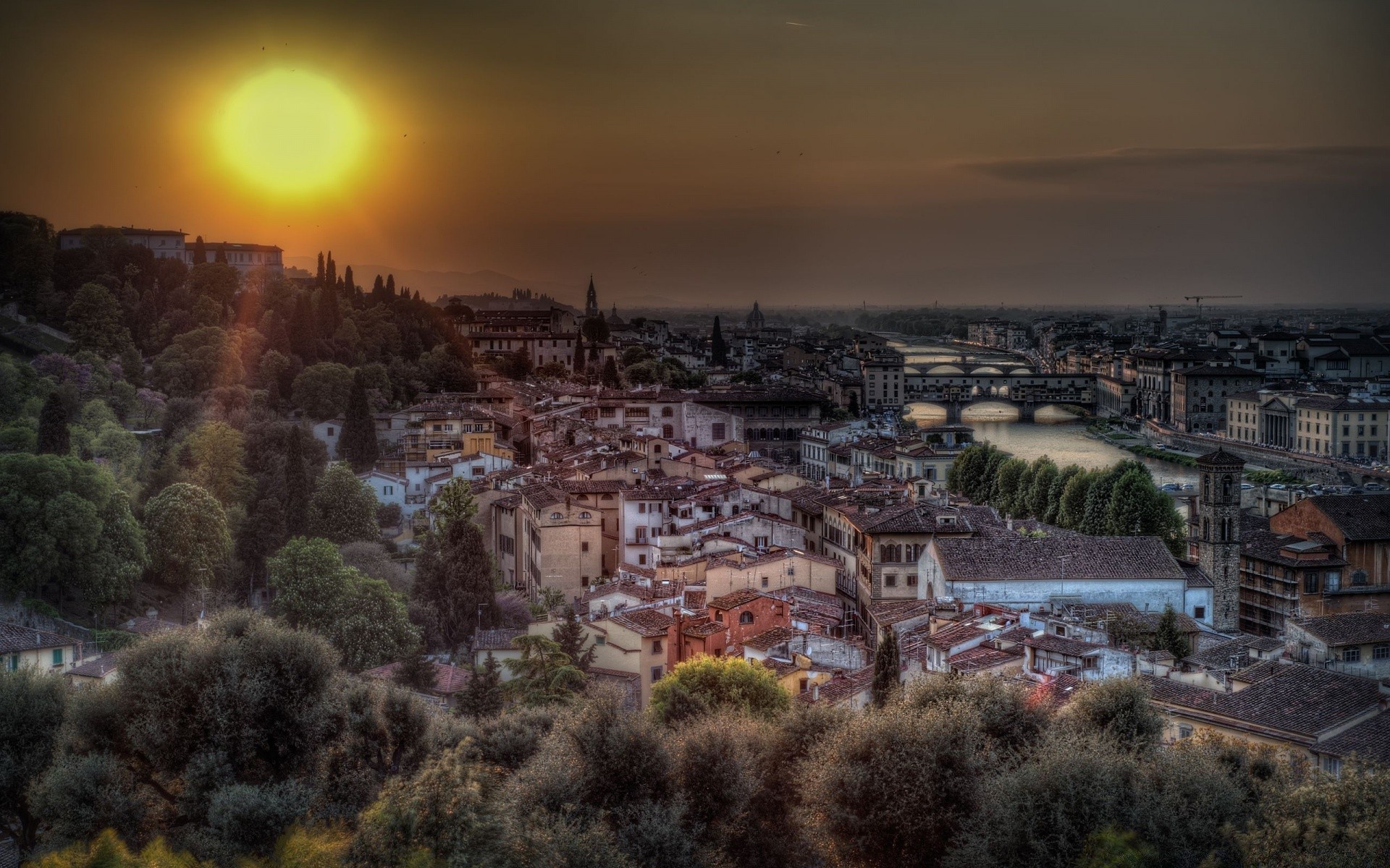 Widok na miasto z góry. Zachód słońca i Wieczorne miasto