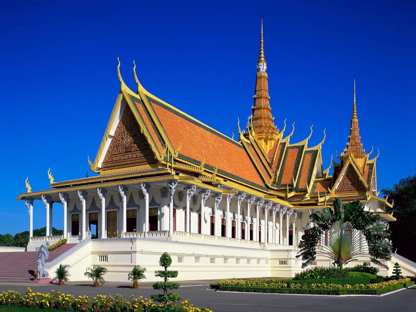 Zamek z fontanną i stawem na tle błękitnego nieba