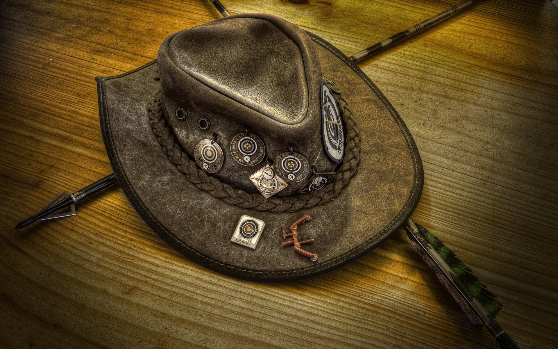 Vintage kapelusz ze strzałami na drewnianym stole