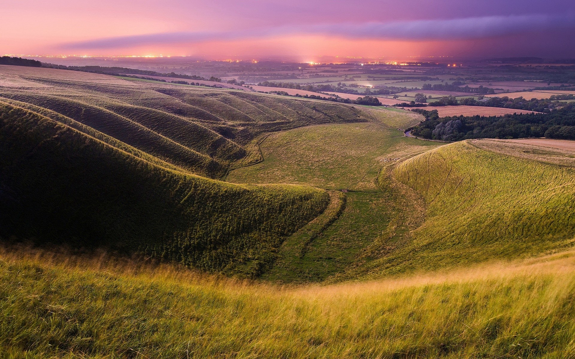 Krajobraz zachód słońca na tle zielonych pól i gór