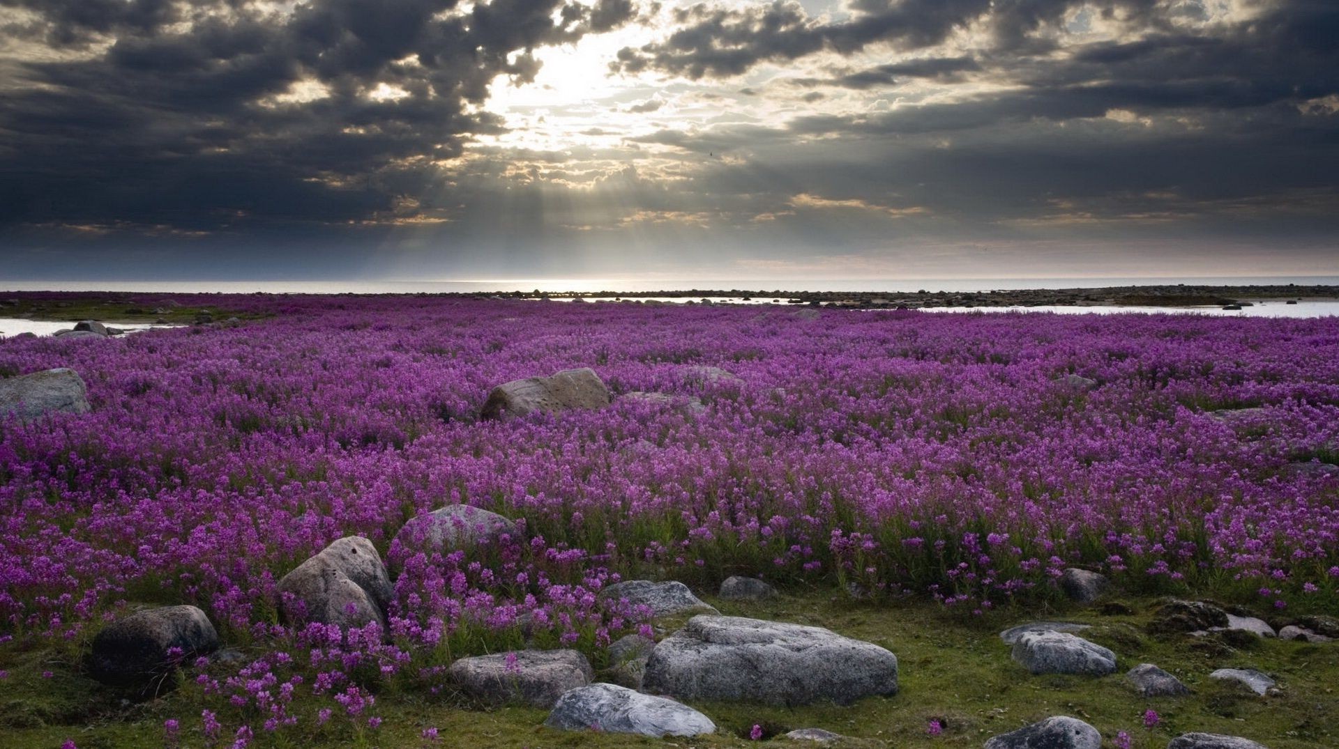 Krajobraz. Pole fioletowych kwiatów o zachodzie słońca