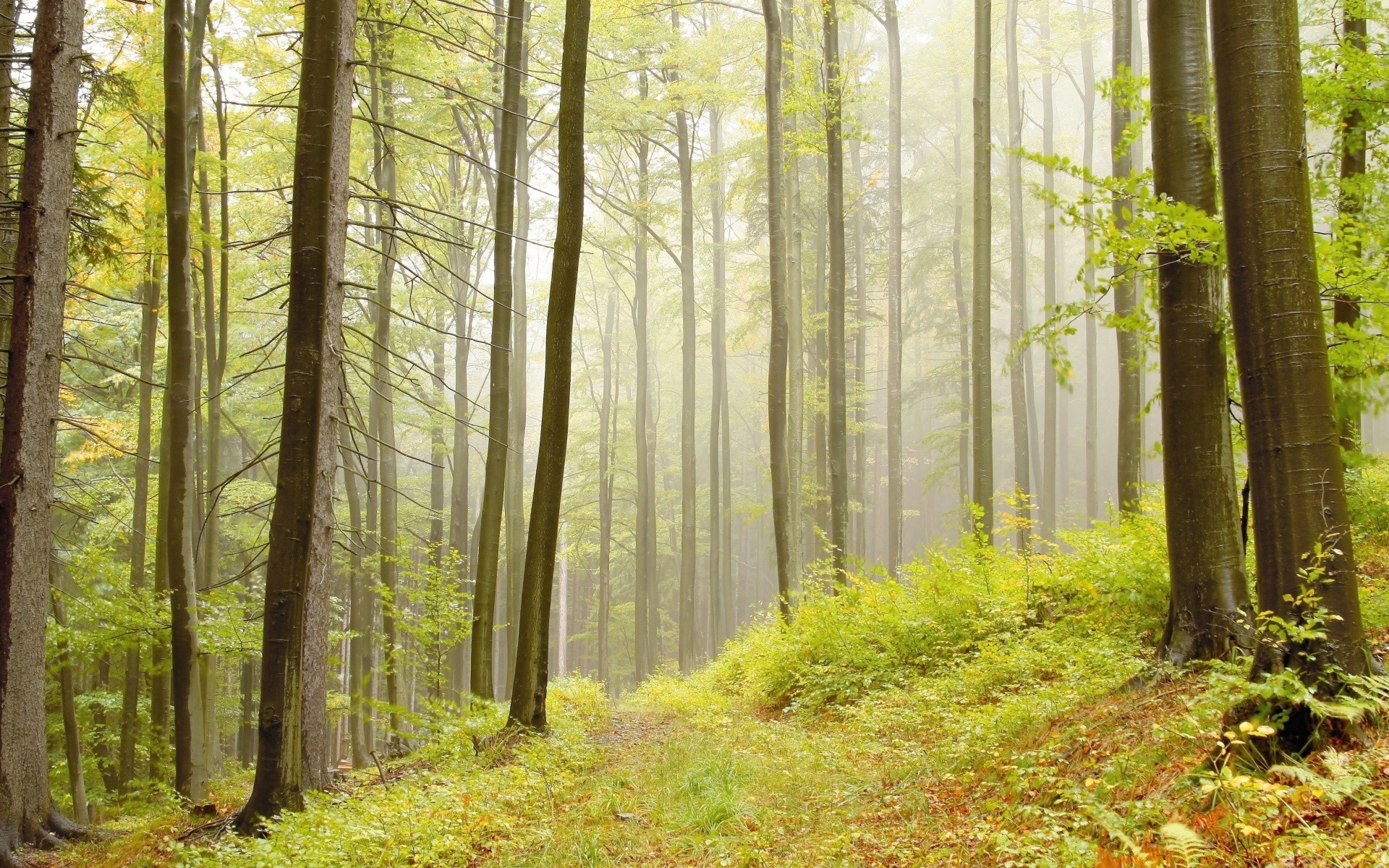 Tajemniczy krajobraz, promienie słońca przedzierające się przez las