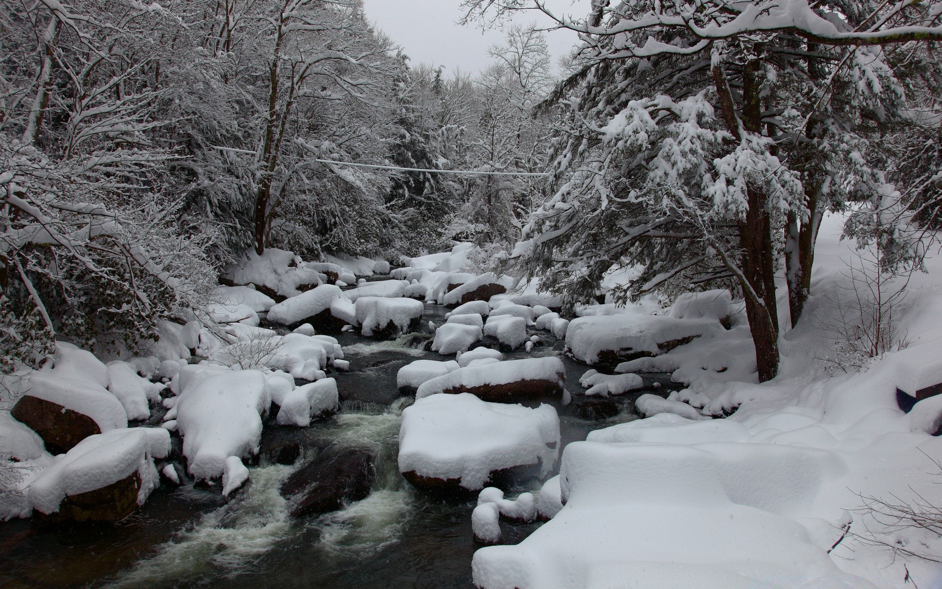Domek ze świecącymi światłami wśród ośnieżonych jodeł