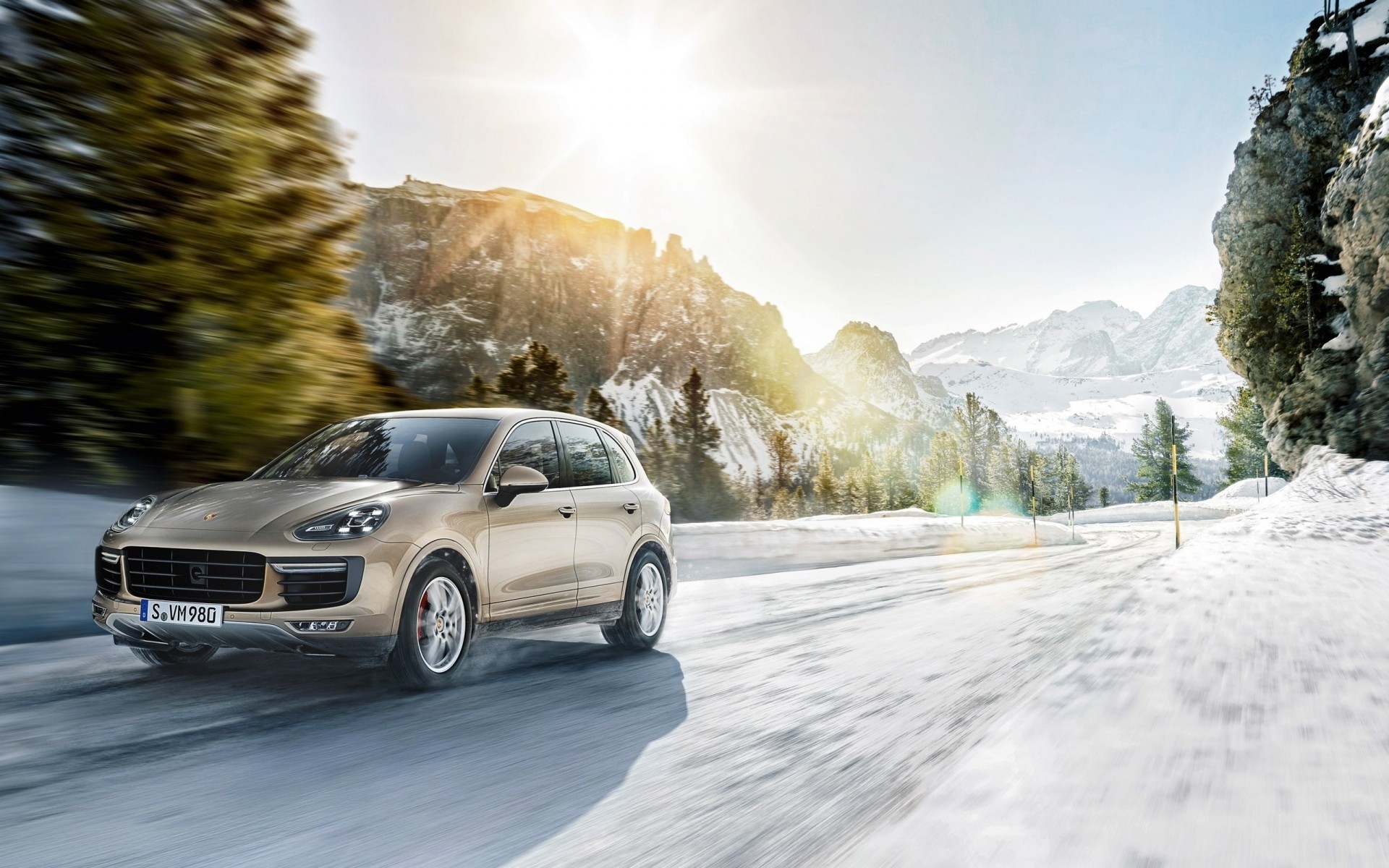 Widok ze szczytu na świerki w śniegu i mgła pod nimi