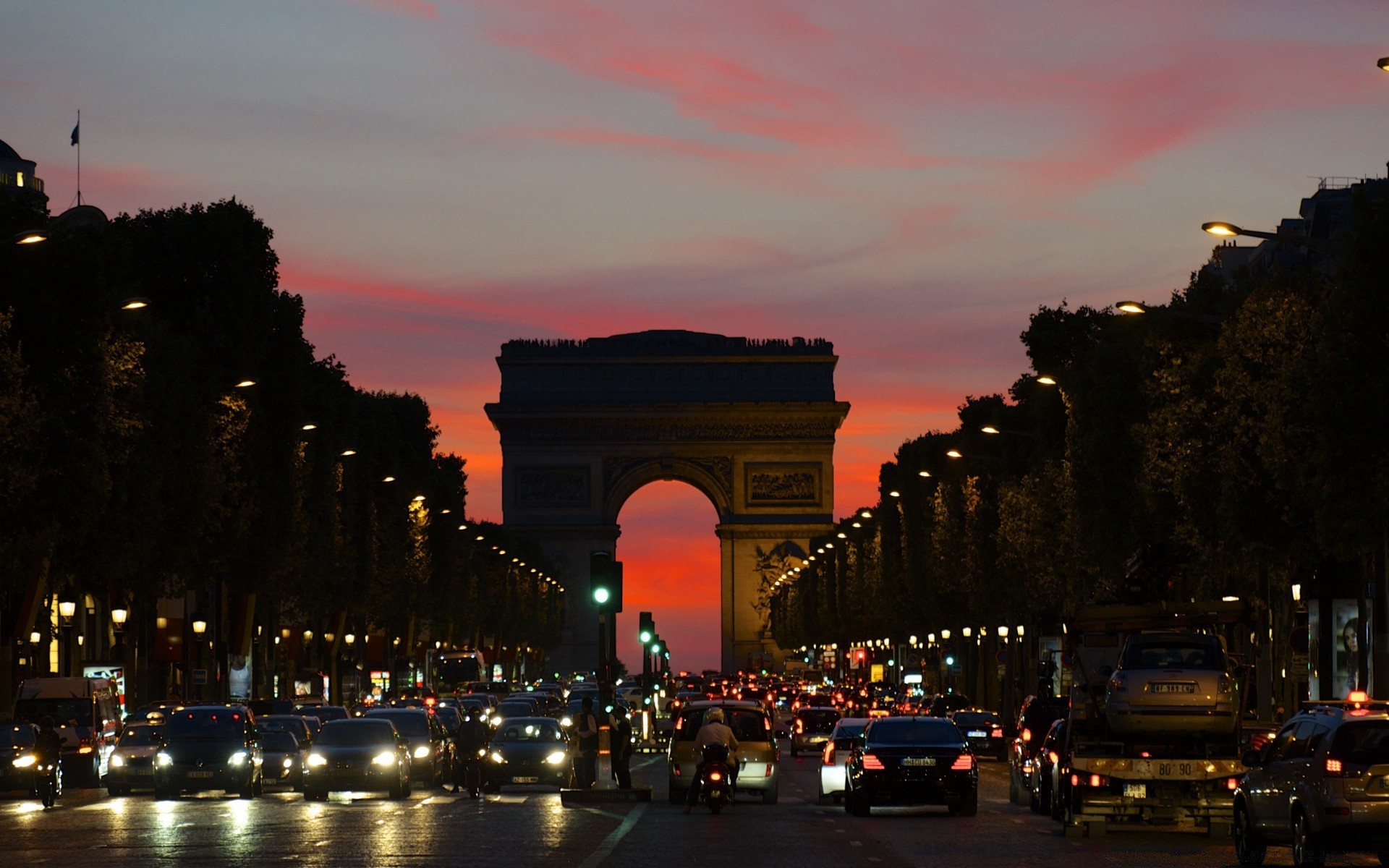 . Wieża Eiffla przez Plac w promieniach zachodu Słońca