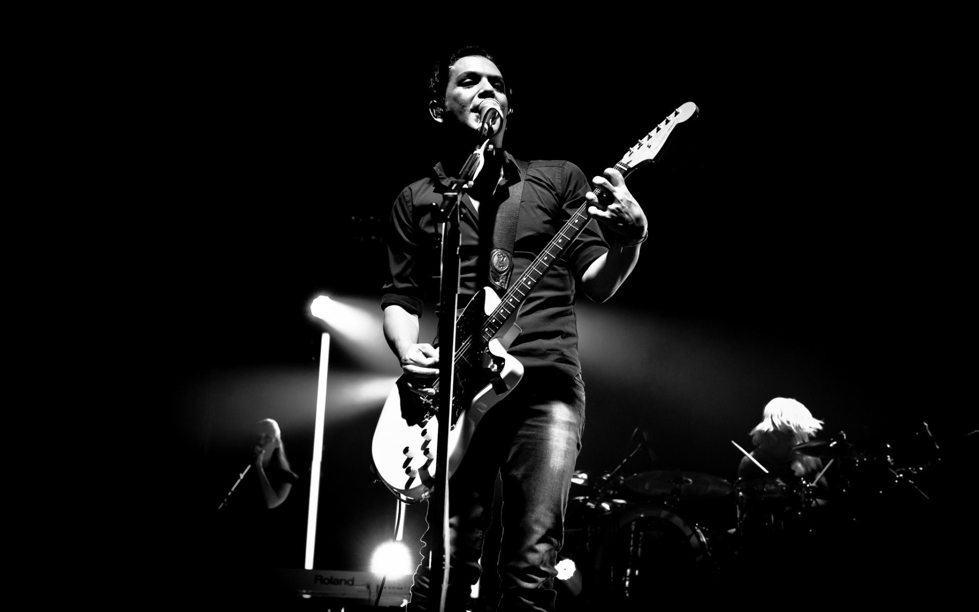 Czterech mężczyzn w ciemnych ubraniach na jasnym tle